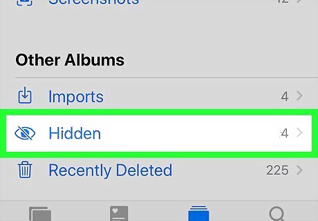 Find your hidden photos in an album called “Hidden.” If you later want to find the pictures you’ve hidden, open your Photos app and click on Albums. Scroll until you see the Hidden album, which has the icon of the 2 rectangles with a slash across them. Clicking on this album will show you your hidden pictures. Note that the photos in the Hidden album aren't password protected.