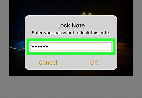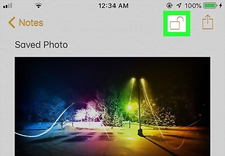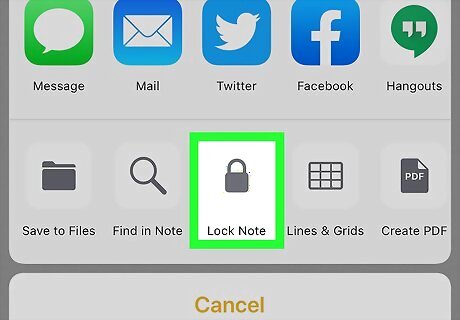 Click the share icon and then Lock Note. Now the Share icon, which is the same image of a box with an arrow going upwards, will be in the top right of your screen. Click on this and then click Lock Note. The Lock Note option will show up as an icon of a lock. Scroll through the row of gray and white icons if you don’t immediately see the lock.