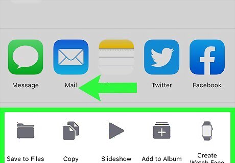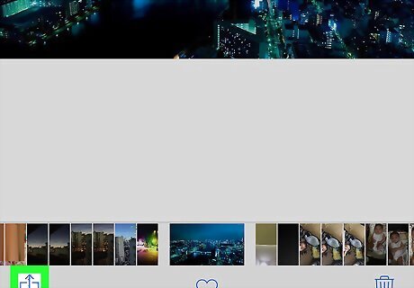 Locate the Share icon and press it. The Share icon is a box with an arrow in the middle of the box pointing straight upwards. It should be at the bottom of your screen once the photo is selected. Click on the Share icon once you’ve located it. If there aren't any icons showing up on the photo you selected, press on the photo once and they should appear.