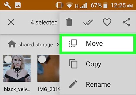 Move the photos you want hidden into the folder. Select the photos you want to hide and transfer them into your new hidden folder. Each app will have a different way of doing this, but usually if you press and hold on the file you want to move, it will show up with an option to transfer it. Now you’re hidden photos won’t show up in the Gallery app. Be aware that the pictures in the hidden folder won’t be password protected.