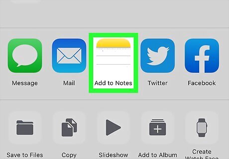 Tap the Share icon and then click Add to Notes. The Share icon is a box with an arrow sticking straight up, located at the bottom of the screen. Click on it, and then a new selection of icons will show up. In the second row of icons, click on Add to Notes, which has a picture of a yellow and white notepad above it. Click Save. You may need to scroll through the second row of icons to find the Notes app option.