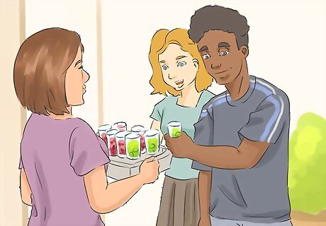 Serve your drinks and appetizers when your guests first arrive. Mix your cocktails and prepare your appetizers 1-2 hours before your guests show up. Keep the food warm, if necessary. This way, you can greet them with a delicious beverage and tasty snack.