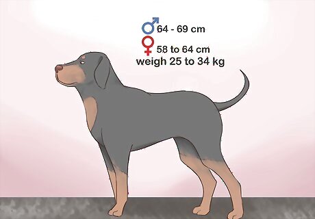 Expect a large, tall body. A black and tan coonhound is a larger-sized dog. The dog has a long-boned body that resembles that of the bloodhound but is slightly more compact. Male coonhounds measure 25 to 27 inches (64 to 69 cm) at the shoulder, while females measure 23 to 25 inches (58 to 64 cm) at the shoulder. Males and females weigh between 55 and 75 pounds (25 to 34 kg).