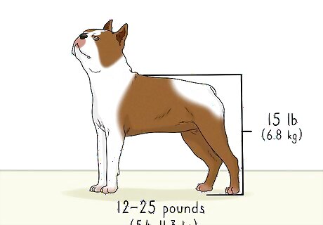 Notice the dog's size. A Boston Terrier can weigh anywhere from 12–25 pounds (5.4–11.3 kg) and should fit into one of three weight classes: under 15 lb (6.8 kg), 15–20 lb (6.8–9.1 kg), and 20–25 lb (9.1–11.3 kg). They are fairly small dogs, standing at 15–17 inches (38–43 cm) in height.