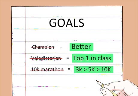 Set reasonable goals. Setting goals that are not achievable is a surefire way to reinforce a negative attitude about the world; that it is too difficult, that it is unfair, that the tide is always working against you, etc. Setting such improbable goals can also kill your motivation. Rather than setting goals such as "I'm going to get all As in school this semester", try setting goals such as "I'm going to try my best to do well in my classes"; or, instead of setting the goal of becoming a famous musician, you might set the goal of practicing music regularly.
