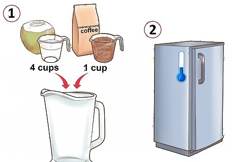 Make a coconut water coffee. In a medium-sized pitcher, mix four cups coconut water with one cup of coarse-ground coffee. Put the pitcher in your fridge overnight, or for at least 12 hours. Filter the beverage through a fine-mesh strainer and into another pitcher. Serve with glasses filled with ice.