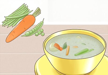 Cook veggies in coconut gravy. Coconut gravy is a spicy mixture that pairs perfectly with tender vegetables. This side dish tastes great over rice or quinoa. To get started, blend 1.25 cups coconut water, ½ cup coconut meat, and one tablespoon corn flour on high until smooth. Combine ½ cup chopped French beans, ½ cup chopped carrots, ¼ cup peas, and ½ cup of water in a microwave safe dish. Microwave on high for four minutes. Set aside. Microwave one tablespoon coconut oil for 20 seconds, then add ½ teaspoon cumin seeds and microwave for 60 more seconds. Grind ½ tablespoon chopped green chilies, ½ cup chopped onions, and ½ teaspoon of chopped ginger into a paste. Add the paste to the oil and cumin. Microwave for one minute. Add the coconut water mixture, stir, and microwave for 90 seconds. Add the vegetables, stir, and microwave for two minutes.