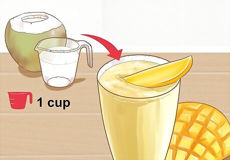 Use it in smoothies. If you love drinking refreshing smoothies after you work out (or just whenever), substitute coconut water in your smoothie for milk. This will give your smoothie a mild tropical twist. For instance, pour one cup of coconut water, one teaspoon of maca powder, three ice cubes, one banana, and ¼ cup diced mango into your blender. Blend on high for thirty seconds.