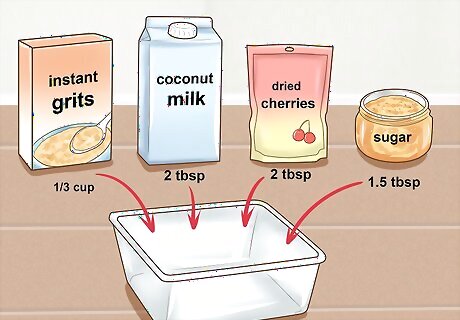 Make overnight coconut grits. Mix 1/3 cup instant grits, two tablespoons coconut milk, two tablespoons dried cherries, two tablespoons chopped pistachios, and 1.5 teaspoons brown sugar in a resealable container. Toss in a pinch of cardamom and a pinch of ginger, if you have them. When you’re ready to eat, unseal the container and add ½ cup boiling water. Mix the water in. Wait about two minutes, then eat.