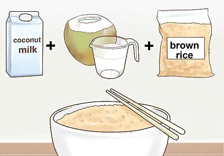 Try coconut rice. Coconut rice is a slightly-sweet fluffy rice prepared with both coconut milk and coconut water. Just mix one teaspoon salt, one cup unsweetened coconut milk, 1.5 cups coconut water, and two cups of brown rice in a medium pot. Bring the pot to a boil, then stir the contents and reduce heat to its lowest setting. Cover the pot with the lid. Simmer for about 15 minutes. The result pairs great with mango chunks, diced sweet potato and raisins, or pineapple chunks.