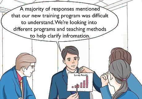 Address the survey results to boost your employee morale. After the deadline, read through all of the responses you received and look for common issues that were brought up. Talk with the upper management at your company to discuss ways you can resolve the problems. Try to bring up the survey results within 2–3 days of the deadline so your employees know you’re working toward solutions. For example, you can say, “A majority of responses mentioned that our new training program was difficult to understand. We’re looking into different programs and teaching methods to help clarify the information.” While you shouldn’t ask who filled out a specific answer, you can still ask your employees for feedback about the issues and work together to solve them.