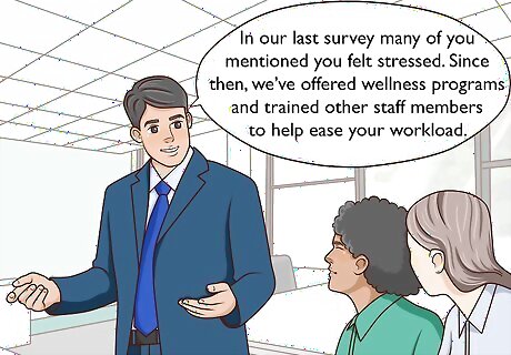 Remind your employees if you've followed through from previous surveys. If you’ve conducted employee surveys in the past, mention the issues that were brought up and how the company resolved them. Give clear, concrete examples so your employees recognize that their responses can affect their work lives. For example, you may say, “In our last survey, many of you mentioned you felt stressed. Since then, we’ve offered wellness programs and trained other staff members to help ease your workload.”