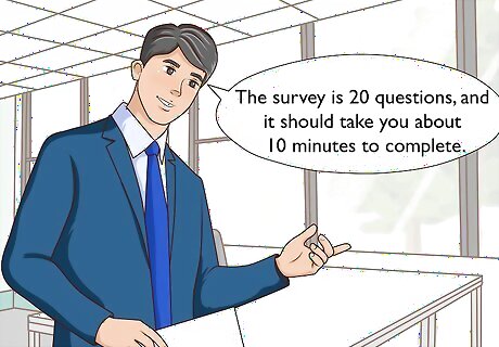 Mention how long the survey should take. Employees don’t want to take a lot of time out of their busy workday to fill out a survey, but they may not realize how quick and easy it can be. As you send out the surveys, tell your employees the length of time they’ll need for filling it out. Once they know it only takes a few minutes, they can finish the survey whenever they have some spare time. For example, you could say something like, “The survey is 20 questions, and it should take you about 10 minutes to complete.” Don’t discourage someone if they want to spend extra time working on their survey since they may be putting more thought into their answers.Tip: Mention the survey’s deadline so your employees know how long they have before they need to submit it.
