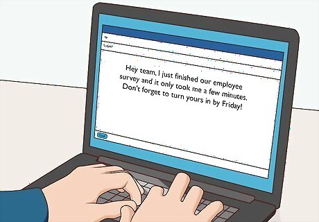 Let your team know when you complete the survey. Even though you’re giving the survey out to your employees, you can still fill one out yourself. Once you finish the survey, send out an email or let your other employees know so they know how easy it is. Once they see you’ve done the survey, they may feel more motivated to do it themselves. Your email can be as simple as, “Hey team, I just finished our employee survey and it only took a few minutes. Don’t forget to turn yours in by Friday!”