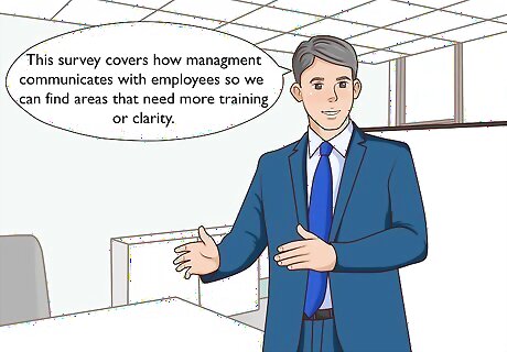 State the purpose of the survey so your employees know it’s important. Employees often don’t fill out surveys if they don’t think anything will change afterward. When it comes time to give the survey, give your employees a specific reason why they should finish it. Let them know what issues the survey covers and how their answers can affect the workplace moving forward. For example, avoid saying the survey is to “make a difference” or “let your voice be heard” since they’re cliché and non-specific. Instead, you could say something like, “The survey addresses how our company manages productivity and how we can improve our efficiency,” or, “This survey covers how management communicates with employees so we can find areas that need more training or clarity.”