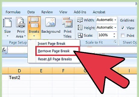 Delete a page break. If you decide you no longer want a page break you’ve inserted, it’s possible to delete the break. Delete a vertical break: Select the column directly to the right of your vertical page break. Click the arrow beneath the “Breaks” icon and select “Remove Page Break.” Delete a horizontal line break: Select the column just below the horizontal page break, then click the arrow beneath the “Breaks” icon. Select “Remove Page Break.”