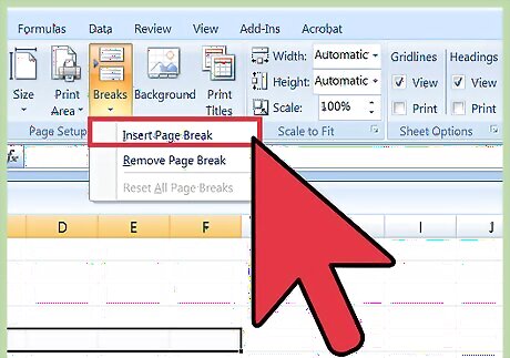 Insert the vertical page break. On the “Page Layout” tab, click the arrow beneath the “Breaks” icon, then select “Insert Page Break.” A thick vertical line will indicate the location of your new break.