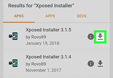 Tap the download icon Android 7 Download next to Xposed Installer 3.1.5. Rovo89 is listed as the developer. You might have to tap the “X” icon to close an ad if one pops up.