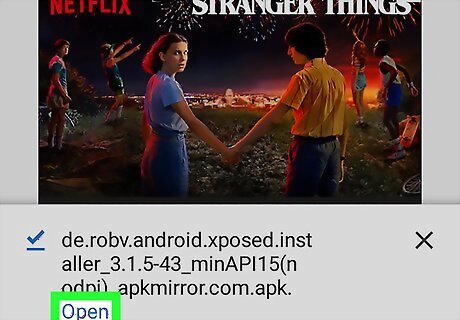 Tap Open from your web browser or the notification. You'll see the download confirmation in your web browser along the bottom of your screen. You can also swipe down from the top of your screen to show the APK download notification and tap on it.