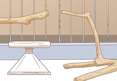Set up different perches. Providing a variety of different perches for your Macaw can help keep them occupied while they are in their cage. Set up perches of different material, like wood and stone. Place them in different areas, and switch their locations around every week or so to keep it interesting. The size of your perches should vary from around half an inch to 2.5 inches (1.27 to 6.35 cm). This variation is size will help keep their feet strong as well as keep them occupied. Parrots love rope swings, so you can add one or more as additional perches in the cage. Swings also give your Macaw a way to exercise.