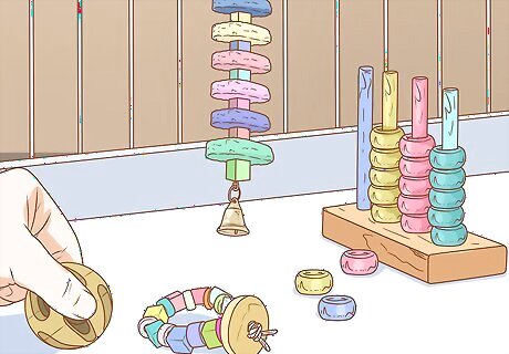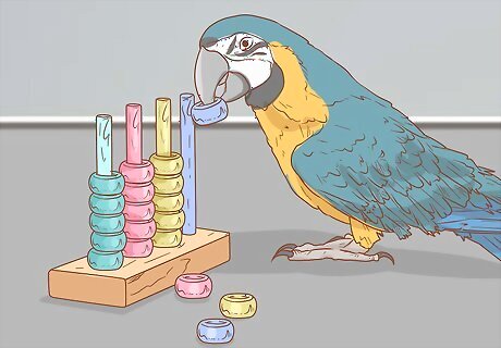 Give your parrot toys it can manipulate. Parrots often stay occupied when playing with toys that mentally and physically stimulate them. Manipulative toys which allow the parrot to move pieces and/or interact with the toy require the parrot to think, keeping it highly engaged. Ladders and ropes can provide physical stimulation while puzzle toys can provide mental stimulation. Various manipulative toys allow parrots to perform sequential tasks like untying knots or disassembling toys. You can buy manipulative toys online or at pet stores. Alternatively, you can buy manipulative toys made for toddlers and repurpose them for your parrot.