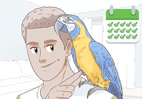 Interact with your parrot daily. Macaws are extremely social birds. They love being around their humans and interacting with them. Make sure to talk to your bird every day. Consider training your Macaw. They are very intelligent birds and can learn a lot of tricks. The time you spend training your bird can help it not feel lonely and strengthen your bond. You can also teach your Macaw to talk.
