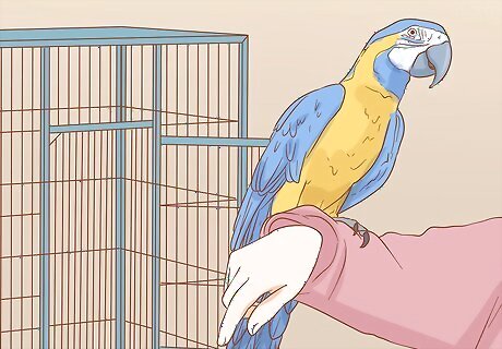 Let the Macaw outside the cage. Your parrot needs to exercise and spend time close to you. This means you should let it out of its cage every day. Put toys around the house for the Macaw to play on, like jungle gyms, bird play areas, perches, and ropes. Make sure the room your Macaw is let out in is safe. It should not contain other pets, open windows or doorways, have exposed wires, or have any harmful substance your bird may get into. You should remove any electrical cords, which your bird could chew on.