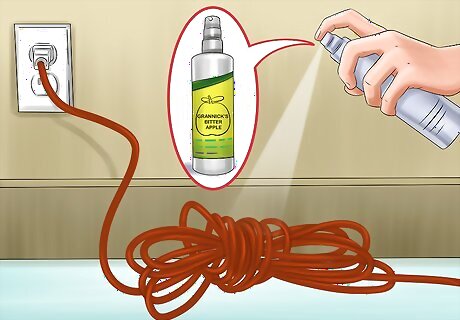 Spray deterrents on your electrical cords. Many deterrent sprays, such as Grannick’s Bitter Apple, have an off-putting taste to discourage your cat from chewing. Unplug your devices and spray the solution on a washcloth. Rub the length of each cord with the cloth so it is coated fully, avoiding the plug.