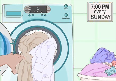 Clean your clothing at the same time each week. Set aside time every week to take care of your clothing. Pick up anything you see on the floor, then wash and sort it as needed. If you can, clean up at the same time every week so you never forget to do it. For example, you may decide that your laundry has to be done by 7:00 PM every Sunday. If you live with others, work together. Staying on track is easier when you have help.