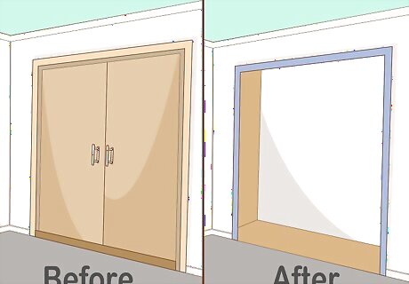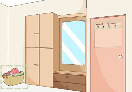 Remove the closet door if it is in the way. Most closet doors restrict what room space is available. If your door opens outward, you may not be able to fit a storage container behind it. Unscrew the door’s hinges and remove it if it is in the way. Make sure you have a friend nearby to hold onto a heavy door. After the door is removed, you may be able to fit a dresser or another storage container next to the closet. An open closet is more accessible, so this can encourage you to move your clothing instead of dropping it on the floor.