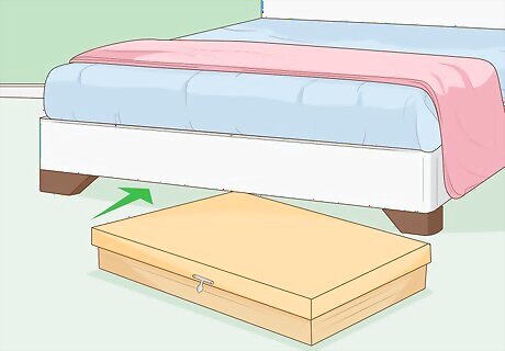 Put storage bins or drawers under your bed. Take advantage of any extra space available under your bed. If you have enough space, you can install drawers and use them like a dresser. Otherwise, get a few plastic containers from a general store and push them underneath the bed to store your clothing neatly. Store seasonal clothing underneath the bed. For instance, place your swimwear in a plastic bin during the winter.