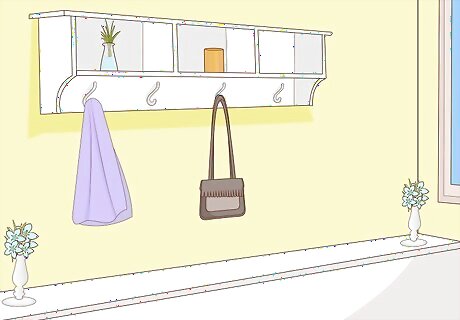 Add another hanging rod to your room. Fit a clothing rod into any space where the walls are close together. A second rod in a space such as the back of your closet opens up a lot of extra storage space, even in a small room. Install it by screwing it onto your wall, then place hangers or hanging organizers on it. You can extend a rod between any nearby walls. Place it in areas you haven’t covered with dressers or decorations. You can also hang hooks from the ceiling, then tie a rod to the hooks with rope.
