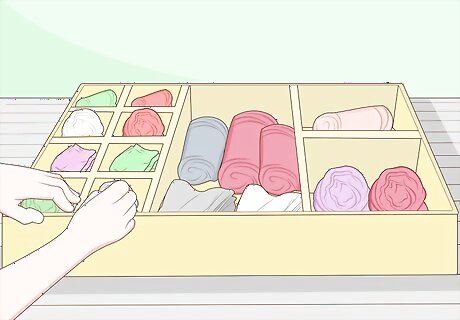 Reorganize the clothing in your storage spaces. Go through your dresser, closet, and other storage containers. If you eliminated unnecessary clothing, you should have an easier time organizing everything into a functional storage system. Sort your wardrobe and rearrange it to maximize your storage space. For example, you may wish to move frequently-worn items like socks into plastic storage bins. This can free up an extra drawer in your dresser.