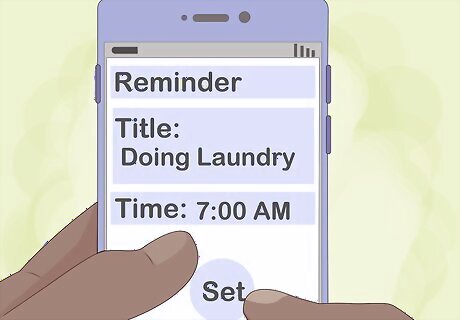 Leave yourself reminders about picking up your clothing. Chore reminders sound annoying, but they can be motivating. Leave yourself notes around the house, on your phone, or on your calendar. Encourage yourself to tackle laundry right away. For example, leave a sticky note on your bathroom mirror. If you need to remind others, you might tell them, “Remember to put away your clothes before you go out.”