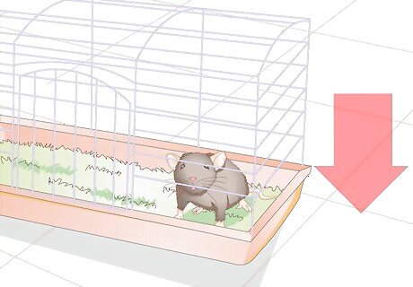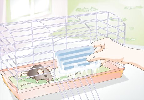 Put ice packs in the cage. Ice packs are a great way to help your mouse keep cool. If you have ice packs, put them in one or two corners of the cage. If you don't, fill a plastic water bottle part way with water and leave it in the freezer overnight. You can also do this with empty plastic containers from margarine or cottage cheese, or by filling a shallow cooking pan with ice water. Set the plastic water bottles on their sides on the floor of your cage. Make sure the bottles won't tip over onto your mouse. Some mice will lie on the bottles/containers/pans, or at least lie against the sides. Others won't. Even if your mouse doesn't lie on the container/bottle, it will still help lower the temperature inside the cage a little.