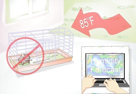 Bring your mouse indoors if it's normally left outside. Some people house their smaller pets in outdoor hutches. While this may have its conveniences, it can be very dangerous in hot or humid weather. Mice are very susceptible to heat stress. It's partly because they're confined to a caged area (and can't retreat to cooler rooms) and partly because they have a hard time regulating their body temperatures. Any time the weather is predicted to get 85 degrees Fahrenheit (30 degrees Celsius) or warmer, you should make sure your mice remain indoors. The same goes for high humidity levels. If the humidity is predicted to exceed 60% in your area, keep your mice indoors.