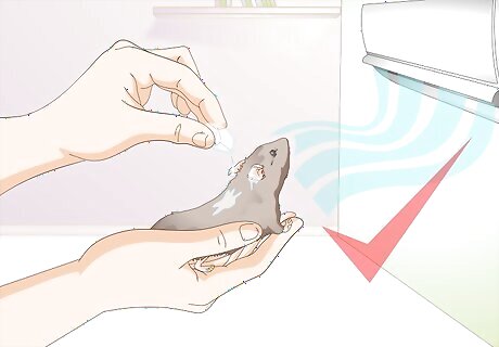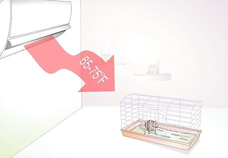 Keep the room cool. In addition to moving your mouse into a shaded part of your home, keeping the room cool is one of the best things you can do. If you're warm in the room, there's a good chance that your mouse is even warmer. If you have air conditioning, make sure it's turned on in the room your mouse cage is in. If you don't have air conditioning, use as many fans as you have to help circulate air around the room. However, fans may not be too helpful since mice do not sweat. The ideal room temperature for mice should be between 65 and 75 degrees Fahrenheit (18 to 23 degrees Celsius).