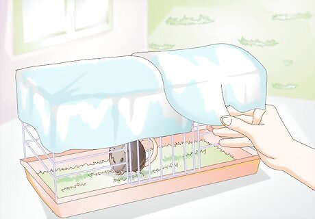 Drape a cold, wet towel over the cage. One easy way to cool off the cage is by hanging cold, wet towels over it. This will help regulate the temperature inside the cage, especially if it's warm in your room. Fill your sink, bathtub, or a clean bucket full of cold water. Add ice cubes to really cool the water down. Soak one or two clean towels in the ice water. Let the fabric adjust to the temperature for a few minutes before you remove them. Wring out any excess water. You don't want the towels "raining" down on your mice, so make sure they're not dripping any water. Drape the towels over the cage. Make sure there are still some gaps between the towels and the floor of the cage to ensure proper ventilation. Check the towels periodically to make sure they're still cool. Repeat as necessary to keep the towels cold.