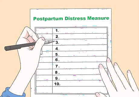 Fill out the Postpartum Distress Measure. Instead of or in addition to the Edinburgh Scale, you may receive the Postpartum Distress Measure from your doctor or therapist. This 10 question survey analyzes your chances of having PPD. Answer the questions according to how you have felt in the past week. If you want, you can take this questionnaire before visiting your doctor. You will need to show your doctor your results so that they can analyze it. You can find it here: http://postpartumstress.com/admin/wp-content/uploads/2012/02/Postpartum-Distress-Measure_4.25.12.pdf