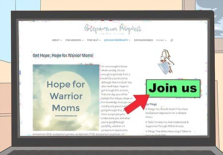 Join a support group for new parents or others with PPD. As a new parent, it is important that you have support. A support group gives you a network of people going through the same experience. You may find a group made for new parents helpful or you may want to look for a group specifically for people with PPD. Look for support groups at community centers, birthing centers, public libraries, and houses of worship. If you want to connect with people with depression or postpartum depression, ask your therapist if there is a local group. These may meet at a hospital, public library, or community center.