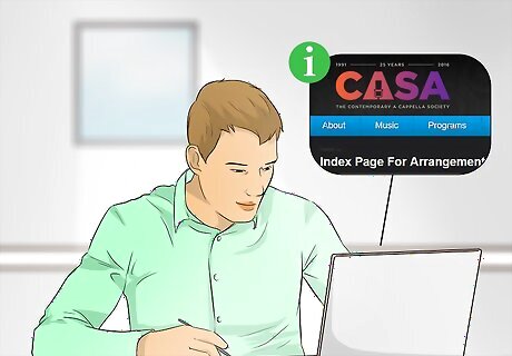 Select songs and arrangements for your group. While you're still new at leading an a cappella group, you can start by using written arrangements that others have made. You'll be able to get some valuable experience under your belt as well as provide the group some practice using established, sound arrangements. There are several resources you can use to find arrangements for your group. Check out the CASA arrangement library online, a cappella listservs, and a cappella sheet music from such publishers as UNC Jazz Press and Hal Leonard.