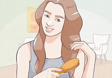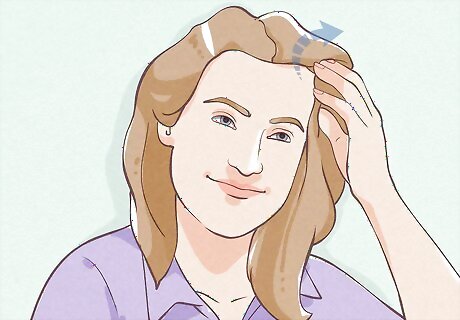 Check your hair. If you’re wearing your hair down (especially if it’s long), arrange it over your shoulders if you want. If your hair is short, make sure that it’s laying the way you want it to. Rub a tiny bit of gel or mousse between your fingers and run it over your hair at the last minute to keep flyaways at bay. If your hair is very long, you may want to only arrange one side of it over your shoulders. If it covers the straps of your shirt or hides the sleeves, you might look naked.