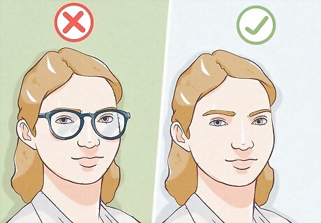 Take your glasses off. This is a requirement. If you cannot remove your glasses for medical reasons, please include a signed note from your doctor with application. Reapply makeup. In particular, if you tend to look shiny in photos, you may want to add a bit of oil-absorbing powder at the last minute. Be sure to also check for lipstick smears or eye makeup that has smudged.