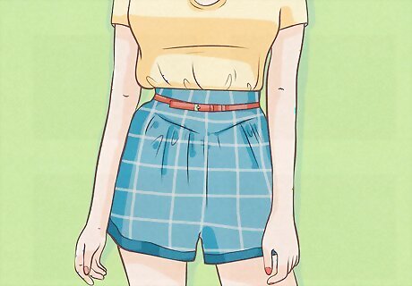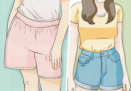 Think about cuts that flatter your body. Just like other types of clothing, different styles of shorts can exaggerate or draw attention away from certain body features. To accentuate curves, wear shorts that are longer and/or have an A-line silhouette. To make your legs look longer or to look taller, wear shorter shorts and/or ones with higher waists. Low-to-midrise cuts will make your torso look longer and your legs shorter. Wear "skinny" or fitted-cut shorts if you have thin legs that you would like to look fuller. Likewise, if you legs are on the thick side, wider cuts will flatter them more.