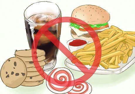 Limit sugars and fatty foods. Less than 30% of your daily calories should come from fat or fatty foods. Before you eat a processed food, read over the label to see exactly what goes into it. If a form of sugar is listed early in the ingredients list, skip it and find an alternative. Also, replace sugary drinks with water. For example, avoid foods that contain glucose or fructose, which are versions of sugar.