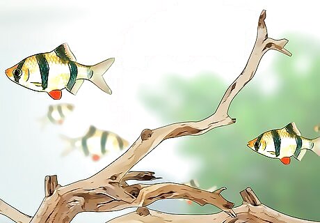Place driftwood in your fish tank for natural filtration and decoration. In addition to looking great in a fish tank, driftwood naturally filters the water in your tank. Aquarium expert Luke Leskovisek recommends adding natural driftwood to your tank, as even the smallest piece can lower the pH and help stabilize it. In addition, the wood will give your fish a new place to explore. Driftwood can sometimes discolor the water in your tank. To avoid this, soak the wood in a bucket of water for several days before adding it to your tank. Do not use driftwood intended for reptile tanks in a fish tank. It may have been soaked in chemicals that could leak into the water and harm your fish. Even a small piece of driftwood will help filter the water in the tank, so pick one that looks like it fits naturally in with your decor.