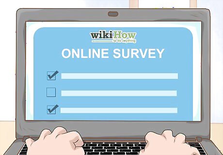 Get paid to take surveys online. Many companies will pay you to take surveys in order to get feedback about their products, services, or target market. Most surveys only take about 5 minutes to complete and are paid between $0.50 and $5 each. Sign up at an online survey site to start taking surveys. MySurvey, Earning Station, Survey Junkie, and iSurvey World are popular paid online survey sites. You might need to sign up on several different sites and do surveys for a while before getting paid. In order to get paid you will normally need a PayPal account. Check to make sure that the site pays in cash, since many survey sites pay in gift cards and prizes.