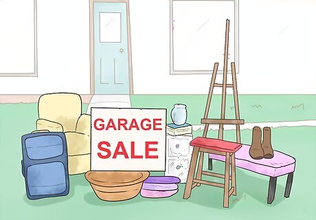 Host a garage sale and sell old or unused items. Look around your house and gather unwanted items into boxes. Consider selling old children's toys, DVDs and video games, furniture, and clothes. Put up signs around your neighborhood advertising your garage sale and let friends and family know. Arrange the items for sale on tables or on a rug. Price your items realistically to increase the amount of money you make. It's better to sell lots of items for a slightly lower price than to only sell a few things. Ask your parents for help if you live at home.