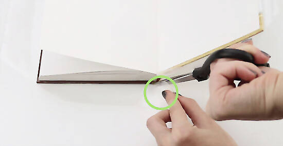 Lift the bottom of the book off the plastic paper, leaving the front cover flap in place. You want to lift the book to reveal the spinal tabs you cut. Then fold down the spinal tabs toward the center of the paper. Gently lower your book back down over the folded tabs.