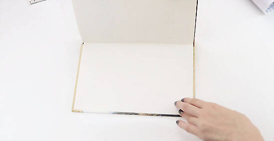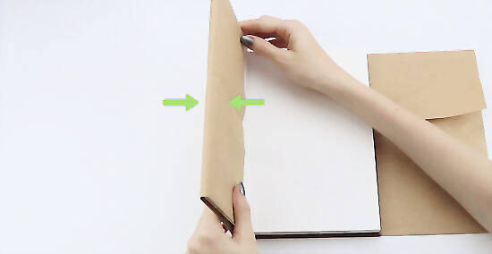 Open the front cover of the book. Fold the left edge of the paper in over the cover. With the front cover open, take the left side of your paper and fold it over the cover. If you have too much paper and the fold goes too far for your liking, cut the excess paper.